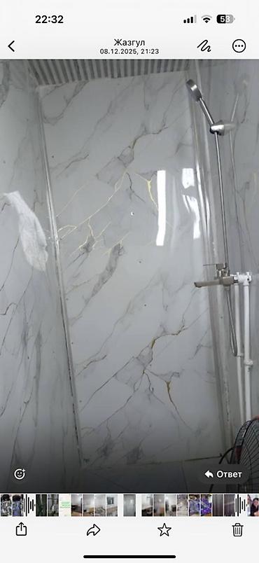 - Санузел с душевой зоной; стены отделаны плитами под мрамор, душевая стойка с лейкой.