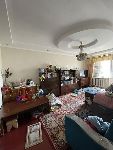- Большая светлая гостиная с двумя окнами, выходом на балкон/лоджию и массивной хрустальной люстрой.