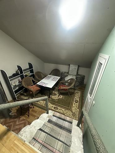 - На втором уровне — столовая зона: стол, плетёные кресла, стеллаж для посуды.