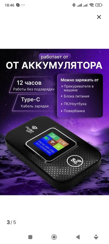Портативный 5G/4G LTE Wi‑Fi роутер (мобильный модем) - Тип: мобильный беспроводной роутер/модем Wi‑Fi - Поддержка сети: 5G (также работает с 4G/LTE) - Скорость передачи данных: до 300 Мбит/с (указ...