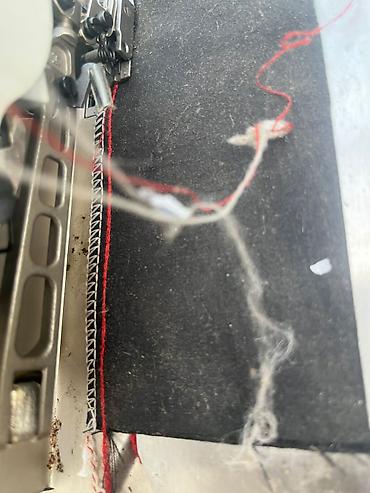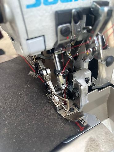 - Результат строчки: аккуратный 5-ниточный шов с одновременной стачкой и обметкой (см. образец на фото, красная/белая нити).