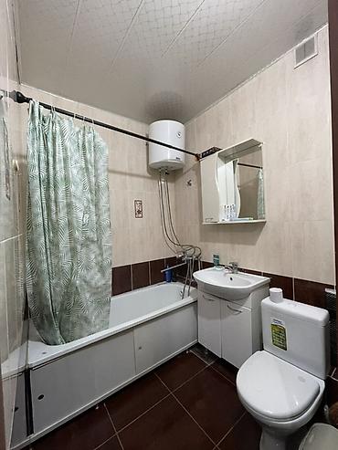 - Санузел совмещённый: ванна с шторкой, умывальник с тумбой и зеркалом, унитаз.