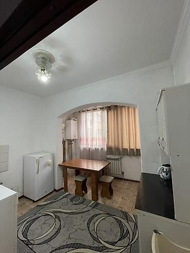- Большая светлая комната с арочным проёмом и окном, высокие потолки, потолочный светильник.