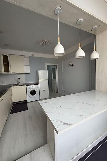 - Три подвесных светильника над столешницей.