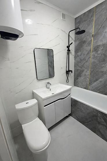 - Полноразмерная ванна, душевой комплект с верхней лейкой.