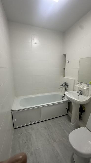 - Санузел с ванной: кафель на полу и стенах, ванна стандартного размера с экраном, умывальник на пьедестале, зеркало с полочкой, смеситель с лейкой, унитаз.