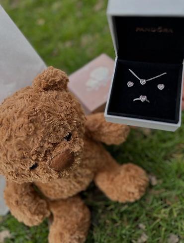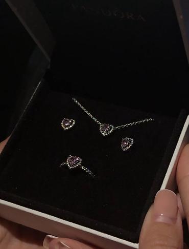 - Набор украшений Pandora в фирменной коробке: кольцо, подвеска на цепочке и серьги-пусеты с сердечными вставками сиреневого цвета и окантовкой из прозрачных камней.