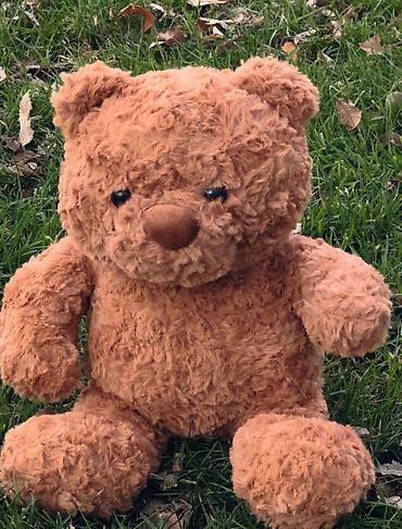 - Плюшевый медведь среднего размера, карамельно-коричневого цвета, с мягким ворсом и вышитыми глазами.