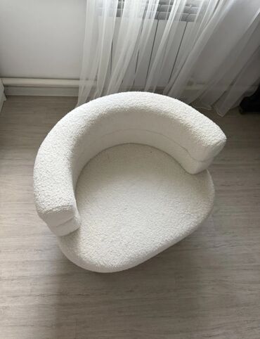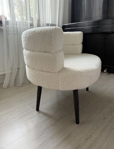 - Обивка: мягкий букле молочного/кремового оттенка с выраженной текстурой — уютно выглядит и приятна на ощупь.