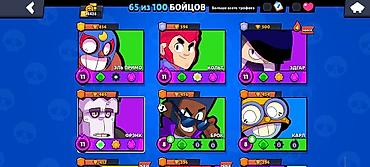 Аккаунт Brawl Stars Характеристики: - Трофеи: 12 103 - Путь к славе: II лига - Собрано бойцов: 59 из 100 - Редкости: есть эпические, мифические, хроматические (на скринах — Фэнг, Бастер, Даг, Чак,...