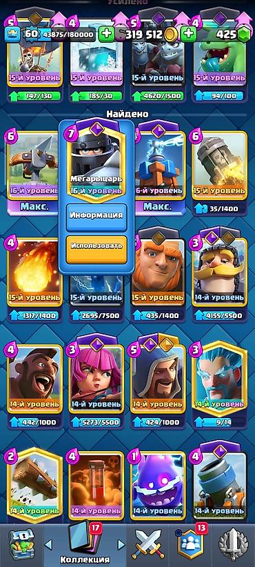 - Сильные прокачанные легендарные/эпические карты: Мегарыцарь 16 уровня, Арбалет 16 уровня (макс.), Башня‑Тесла 16 уровня (макс.), Огненный шар 15 уровня, Ракета 15 уровня, Электродракон 15 уровня, Гигант 15 уровня и др.