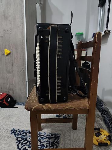 - Левая сторона: кнопочная басовая секция с рядами белых кнопок