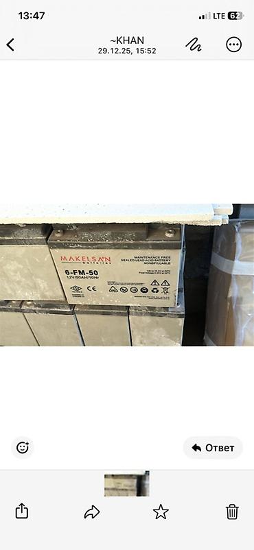 - Свинцово-кислотные герметичные аккумуляторы MAKELSAN 6-FM-50: 12V, 50Ah (10Hr), maintenance-free, non-spillable. Маркировка на корпусе: CE и стандартные пиктограммы по безопасности и утилизации.