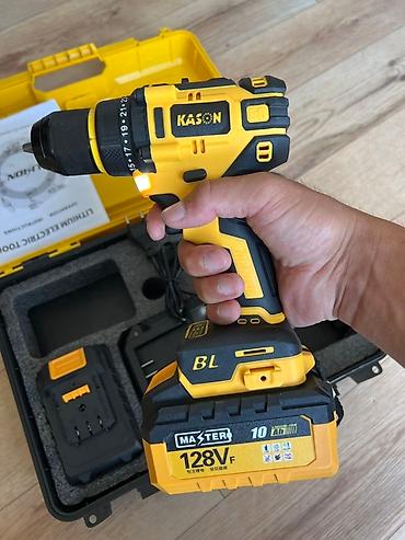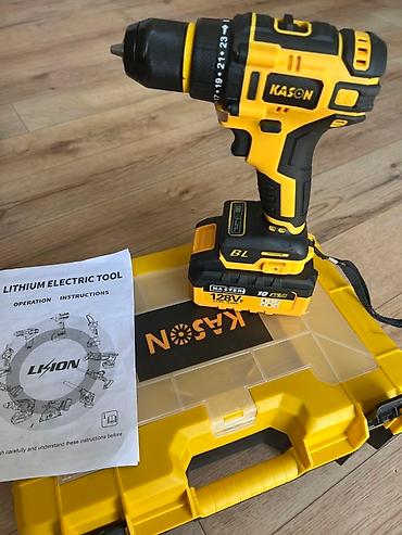 Аккумуляторная дрель Kason в черно- желтом корпусе предназначена для