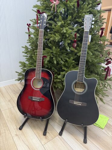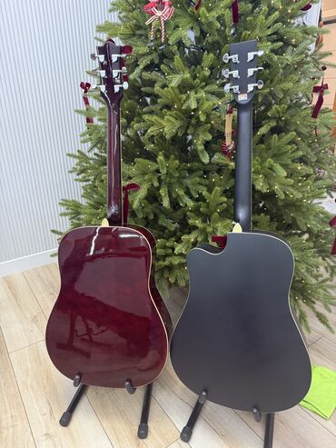 Акустические гитары 4/4 (две модели) - Тип: акустические шестиструнные гитары, полный размер 4/4. - Корпус: дредноут. - Окраска: - Черная глянцевая с двойной окантовкой вокруг розетки. - Гради...