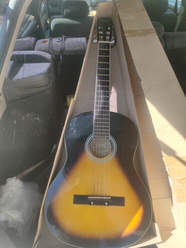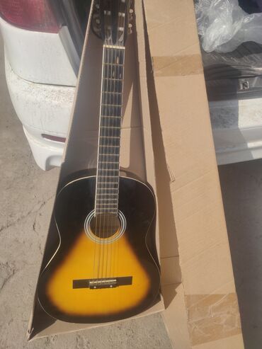 - Корпус: дредноут с глянцевым покрытием, цвет sunburst (желто‑черный), задняя дека и обечайки — чёрные с окантовкой.