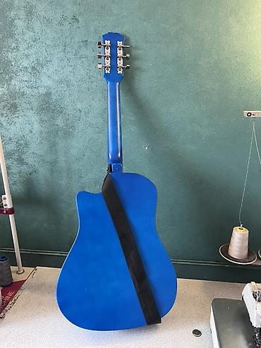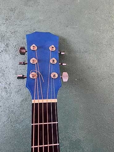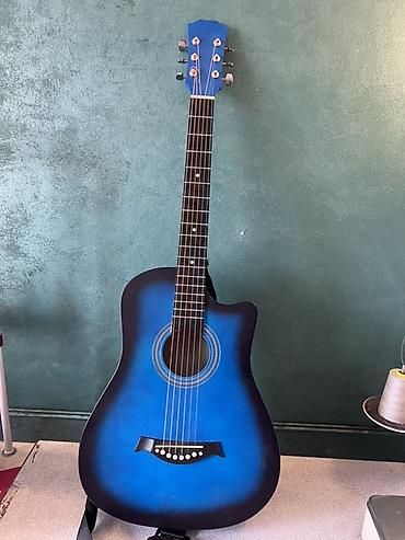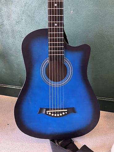 Акустическая гитара 6 струн, форма дредноут с вырезом (cutaway). Корпус и гриф окрашены в градиентный синий цвет, матовое покрытие. Розетка с декоративными кольцами. Бридж классического типа с белыми вставками, металлические колки хромированного цвета. Накладка грифа тёмная с позиционными метками. На головке – стандартная схема 3+3. Установлен ремень для игры стоя.