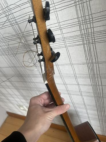 Состояние внешних поверхностей видно на фото: на верхней и задней деке присутствуют следы/сколы лака и наклеек, на головке/грифе — следы эксплуатации; одна струна ослаблена и намотана. Инструмент подходит для домашней игры, обучения, а также как база под реставрацию/кастомизацию.