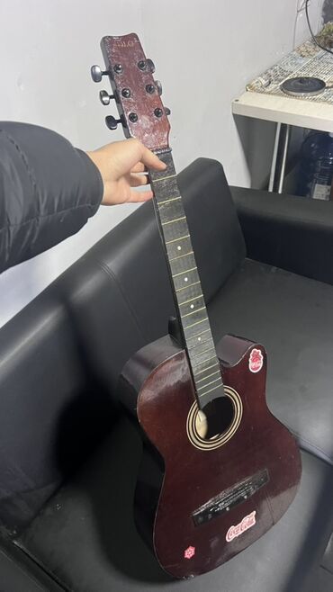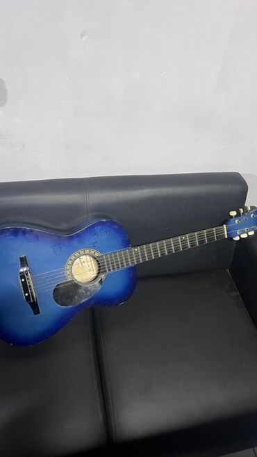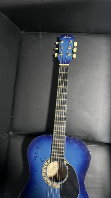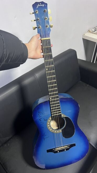 Акустическая гитара Jixing, полноразмерная (формат dreadnought), с нейлоновыми/металлическими струнами и защитным гитарным пикгардом. Корпус окрашен в синий градиент (blueburst). На верхней деке видна декоративная розетка вокруг резонаторного отверстия. Гриф с накладкой на 20 ладов, верхний порожек и колки светлого цвета. На корпусе имеются следы использования и надписи маркером. Нижний держатель ремня установлен. Отлично подходит для обучения, аккомпанемента и домашних репетиций.(без струн 2 гитары? Цена договорная