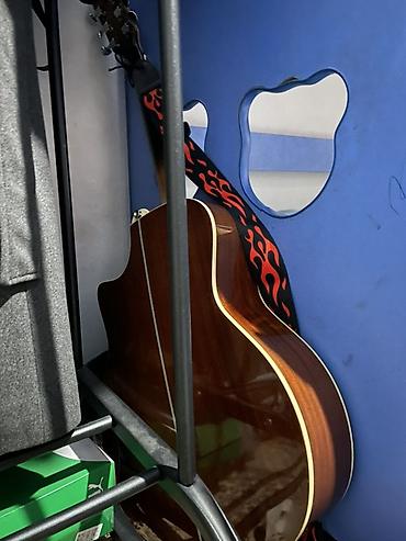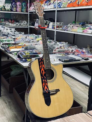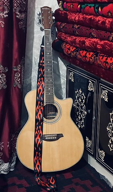 Акустическая гитара с вырезом (cutaway) и ремнем с узором «пламя»