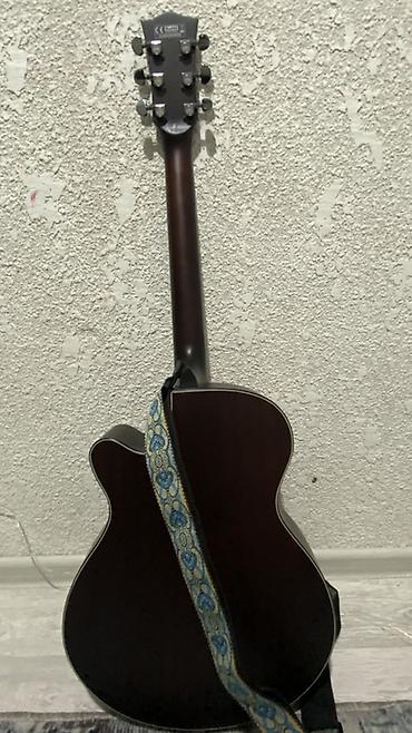 - Гриф: крепление на болтах не видно, классический акустический гриф с накладкой темного дерева, точечные маркеры ладов