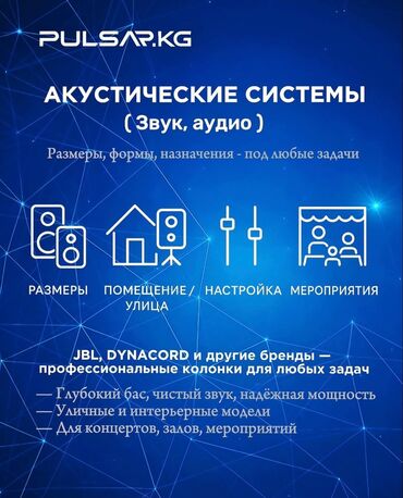 Профессиональные акустические системы JBL и Dynacord обеспечивают глубокий бас и чистое звучание, подходящие для различных мероприятий. Эти колонки подходят для использования на концертах, в залах и на других мероприятиях. Доступны уличные и интерьерные модели, что позволяет подобрать оптимальное решение для любых задач.