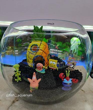 Новый аквариум. Объём 5 л. Хороший подарок детишкам. В стиле Губка Боб. В наличии разные виды аквариумов, декораций, более чем 40 видов рыбок. На любой вкус. Звоните перед выездом.