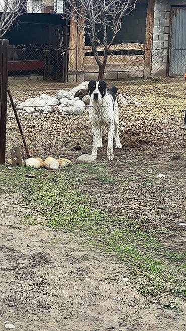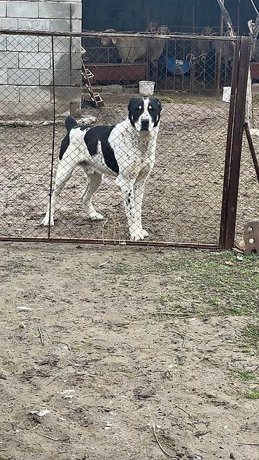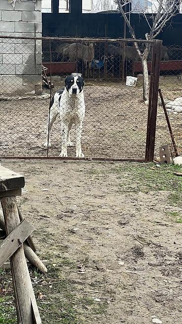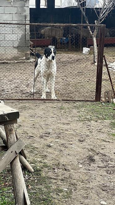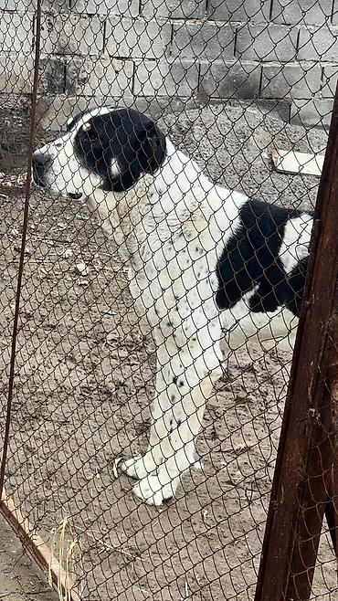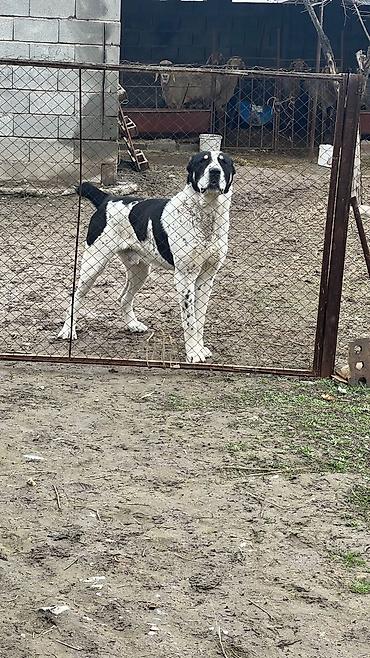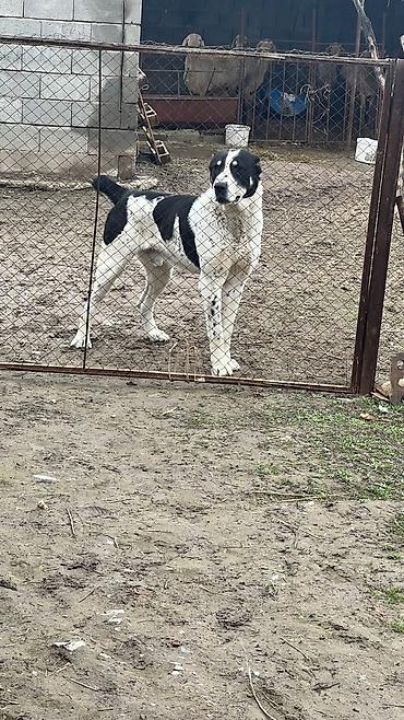 Среднеазиатская овчарка (алабай) — кобель, крупного формата. Окрас белый с чёрными пятнами, мощный костяк, широкая грудь, крепкие лапы. Выраженная сторожевая поведенческая реакция: внимательно контролирует территорию, подаёт голос при приближении посторонних. Привык к содержанию во дворе/вольере, ориентирован на охрану хозяйства и скота. Подходит для частного дома или подворья как надёжный караульный пёс.