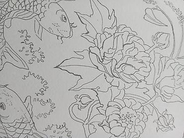 - Набор готовых контурных рисунков в восточном стиле для раскрашивания акварелью: карпы кои, пионы, лотосы, ветви и орнаменты.