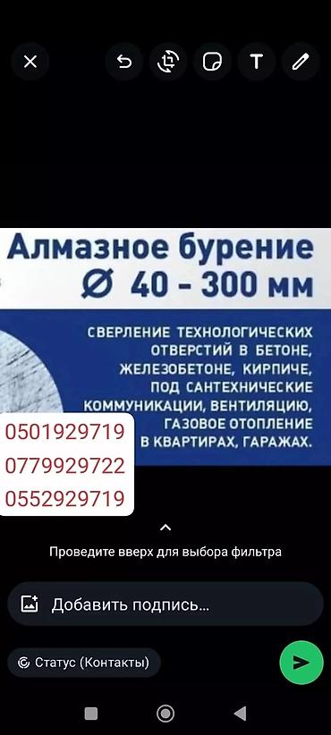 Алмазное сверление и резка проемов в Бишкеке Профессиональные услуги по алмазному бурению и резке: - Точное сверление отверстий под вентиляцию, кондиционирование, водопровод, канализацию, отоплени...