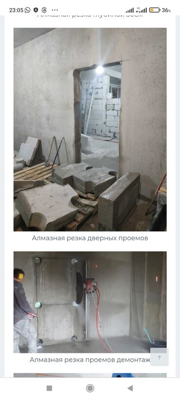 Алмазная резка бетона и проёмов Профессиональные работы по алмазной резке: - Резка железобетона, монолита, плит перекрытия, кирпича, асфальта - Устройство проёмов под двери, окна, лестницы, вентка...