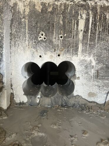 Предлагаются услуги по сверлению отверстий в бетонных стенах. Изображение демонстрирует результат алмазного бурения, идеально подходящего для создания проемов под коммуникации, вентиляцию или други...