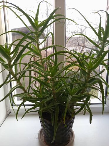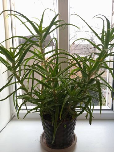 Алоэ (взрослое, крупное комнатное растение) - Мощный куст с несколькими высокими стеблями, густо облиственными розетками. - Длинные мясистые листья с мягкими зубчиками по краям, классический лекар...