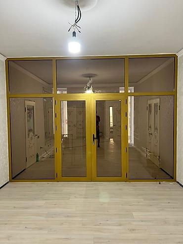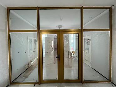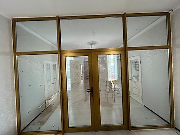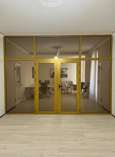 - Конструкция: стационарная перегородка из алюминиевого профиля с центральной распашной дверью и двумя боковыми фиксированными створками, верхняя светопропускная фрамуга по всей ширинео.аа