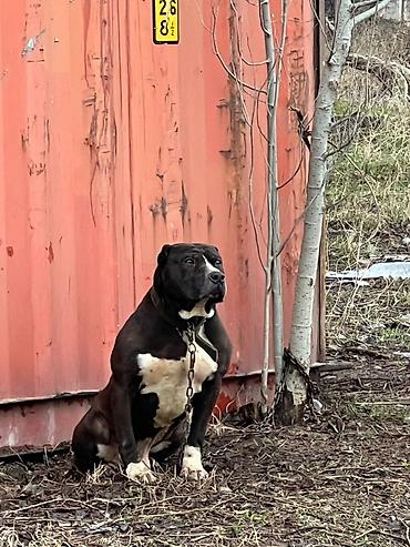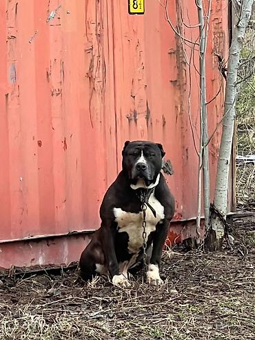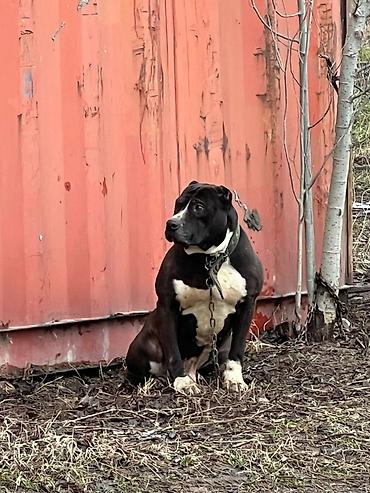 Американский питбультерьер (кобель), крупный и мощный, классического черно-белого окраса с широкой белой отметиной на груди и морде. Широкая грудь, крепкая шея, плотная мускулатура, уверенная посадка. Короткая гладкая шерсть, удобна в уходе.