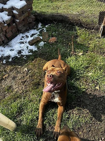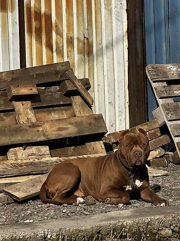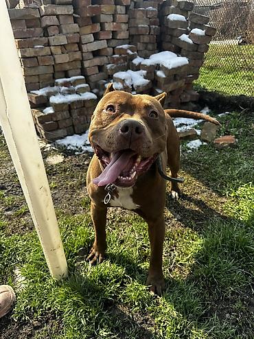 Кобель крупного размера, короткошёрстный, рыже-коричневый окрас с белыми отметинами на груди и лапах. Массивная морда, крепкое телосложение, развитая мускулатура. Стоячие/полустоячие уши, хвост сре...
