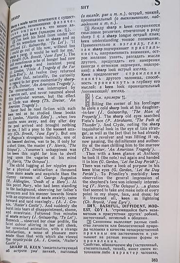 - Тематические статьи с разбором значений и оттенков смысла английских слов, пометами по употреблению, типичными коллокациями и примерами из художественной литературы.