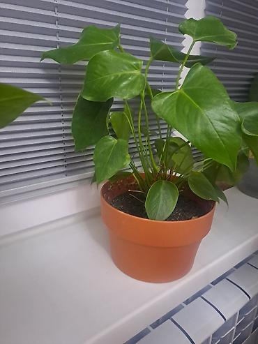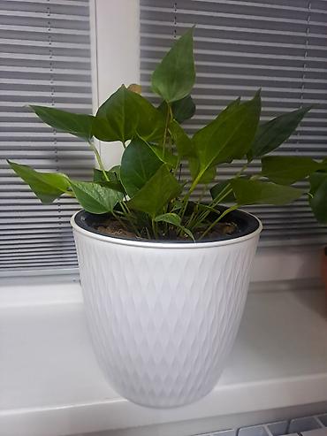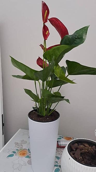 Большой 2000 сом. Декоративно-цветущее комнатное растение с плотными зелёными листьями и яркими красными прицветниками со светлыми початками. Долго цветёт, эффектно смотрится в интерьере.