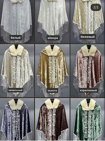 - Материал: бархатистое полотно с переливом, мягкая подкладка. Воротник из искусственного меха. По центру декоративная орнаментальная полоса. По краю – длинная бахрома.