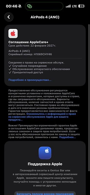 - Поддержка AppleCare+ (активно до 22 февраля 2027 г.; серийный номер H1069CHY46 — скрин подтверждения на фото)