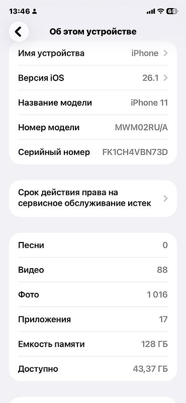IPhone 11, 128 ГБ, модель MWM02RU/A (серийный номер на скриншоте). Цвет — черный.