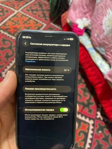 - Аккумулятор: максимальная ёмкость на скриншоте — 82%; включена «Оптимизированная зарядка»