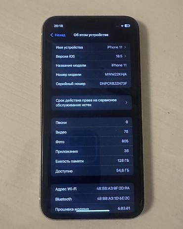 Apple iPhone 11, белый цвет - Память: 128 ГБ - iOS: 18.5 - Номер: MWN22KH/A (официальный товар Apple) - Дисплей: , Face ID - Аккумулятор: максимальная емкость 82% - Цвет корпуса: белый - Серийный ...