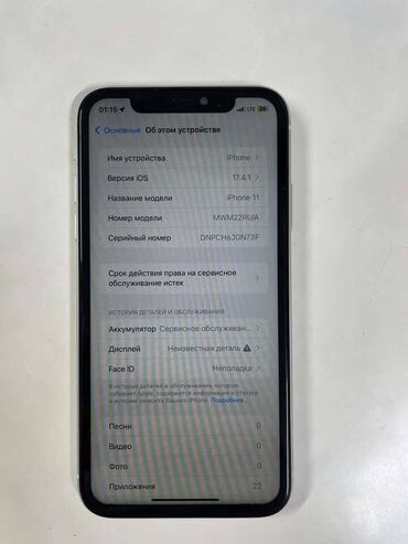 IPhone 11, белый цвет Характеристики и детали: - Модель: iPhone 11 (модельный номер MHDC3RU/A) - Память: 64 ГБ - Серийный номер на скрине: FFWGT6V5N736 - iOS: 16.2.2 (по скриншоту указано «26.2», ...