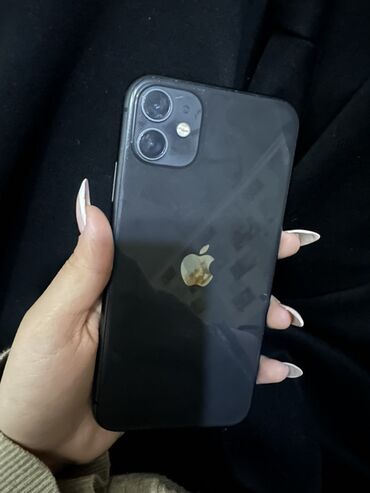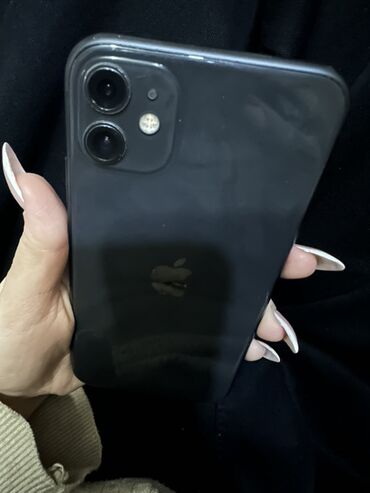 IPhone 11, черный цвет. Две основные камеры 12 Мп (широкоугольная и ультраширокая) с вспышкой, режимы Портрет, Ночной, 4K‑видео. Фронтальная камера TrueDepth. Корпус из стекла и алюминия.