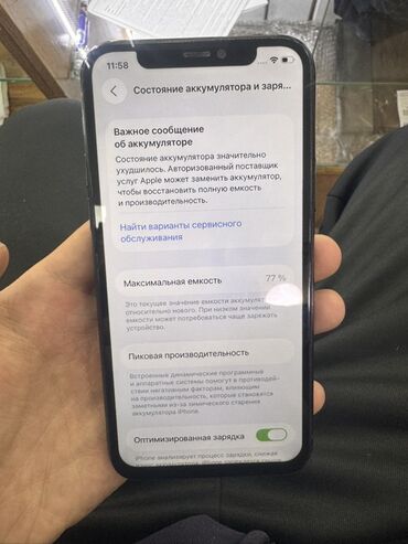 - Показано на фото: максимальная ёмкость аккумулятора 77% (есть системное уведомление о необходимости обслуживания батареи).