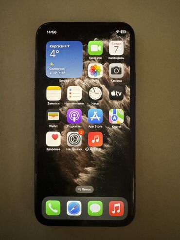 - На экране установлен актуальный iOS с виджетами и стандартными приложениями