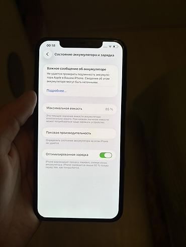 - Состояние аккумулятора по меню — 85%; iOS показывает уведомление о невозможности проверить подлинность аккумулятора (установлен неоригинальный или менялся).