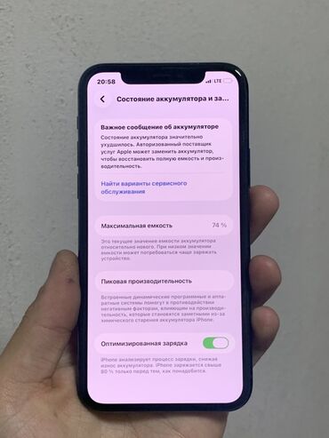 - Аккумулятор: максимальная ёмкость 74%, в разделе «Состояние аккумулятора» отображается сообщение о необходимости сервисной замены.