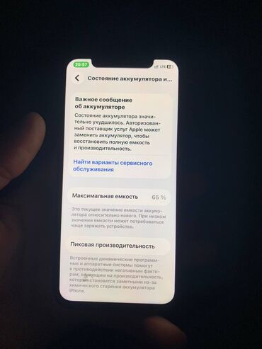 - На экране показано: максимальная ёмкость аккумулятора 65%, отображается системное уведомление о необходимости сервисной замены батареи